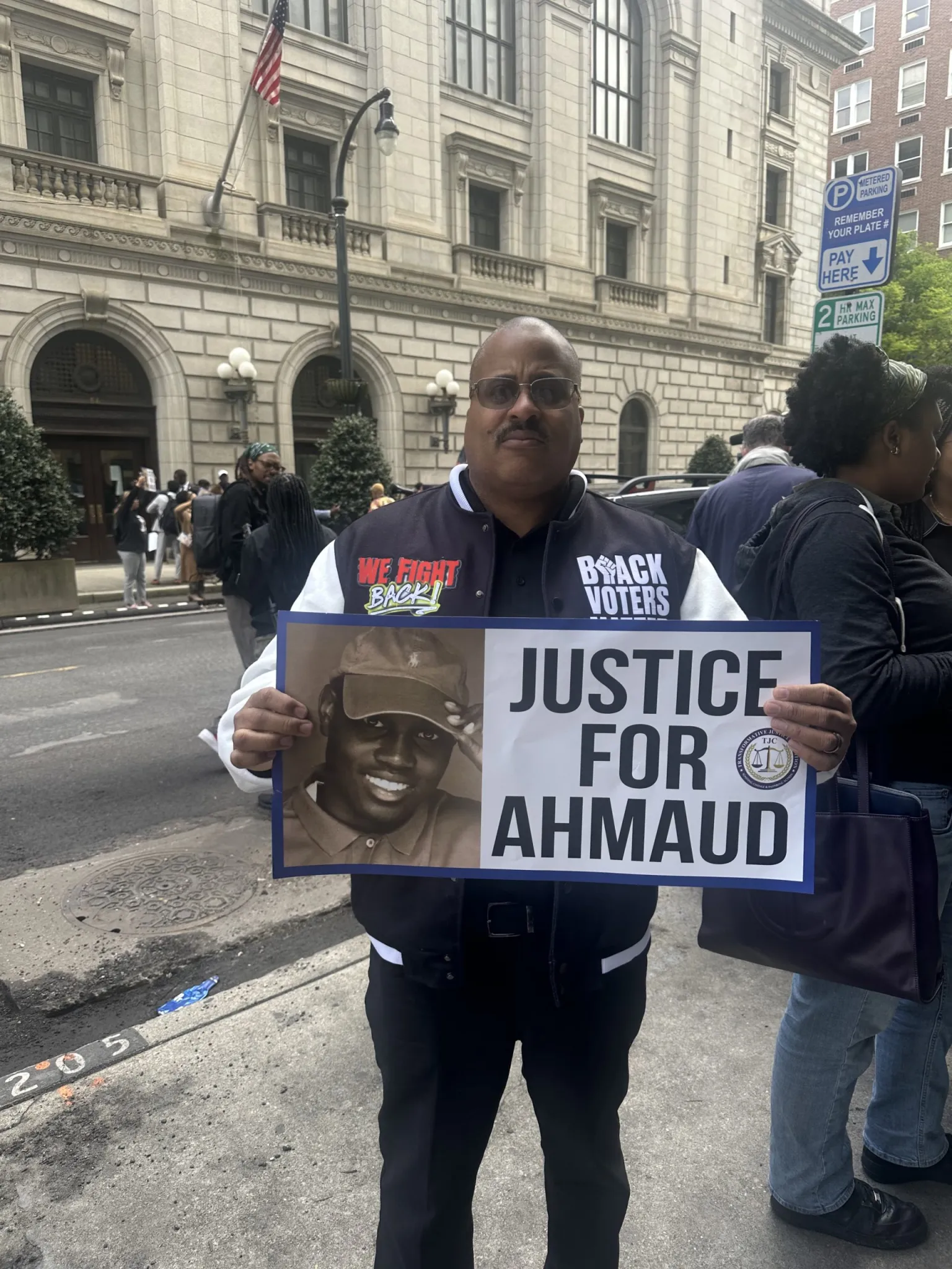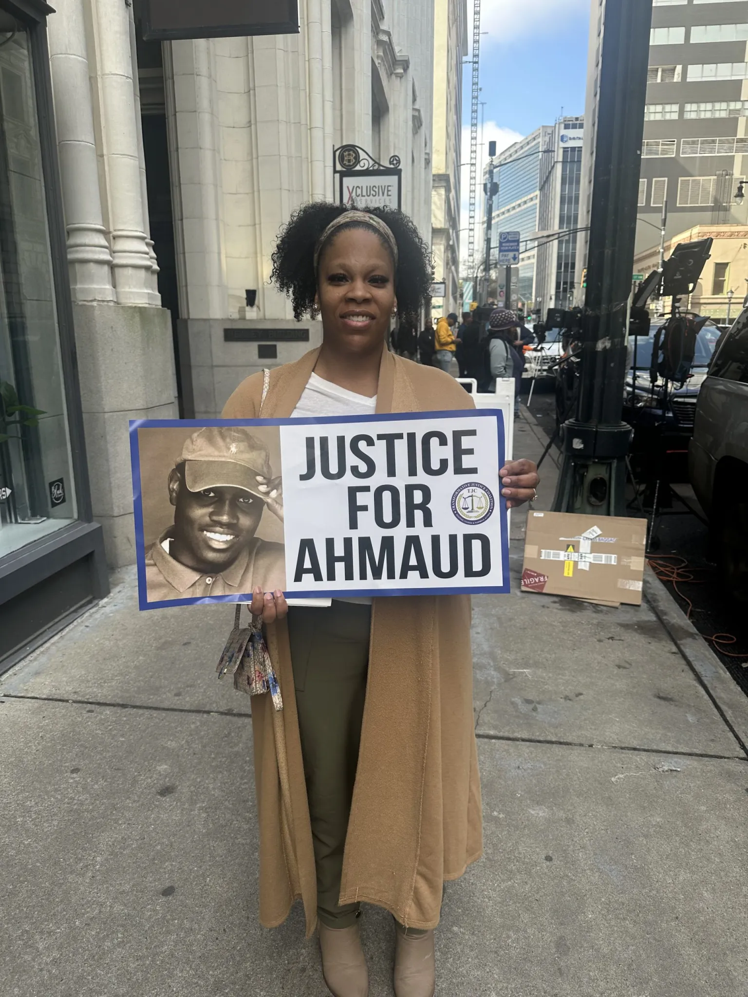 A number of supporters that were not affiliated with any of the organizations or the Arbery family were also in attendance, including Alichia Lewis. Originally from Little Rock, Arkansas, Lewis was standing outside the courthouse holding a “Justice for Ahmaud” sign. Lewis was in the courtroom for the appellate hearings. She wasn’t impressed with the defense. “They tried to bring up irrelevant stuff, but it didn’t work,” she said. “It was interesting.”